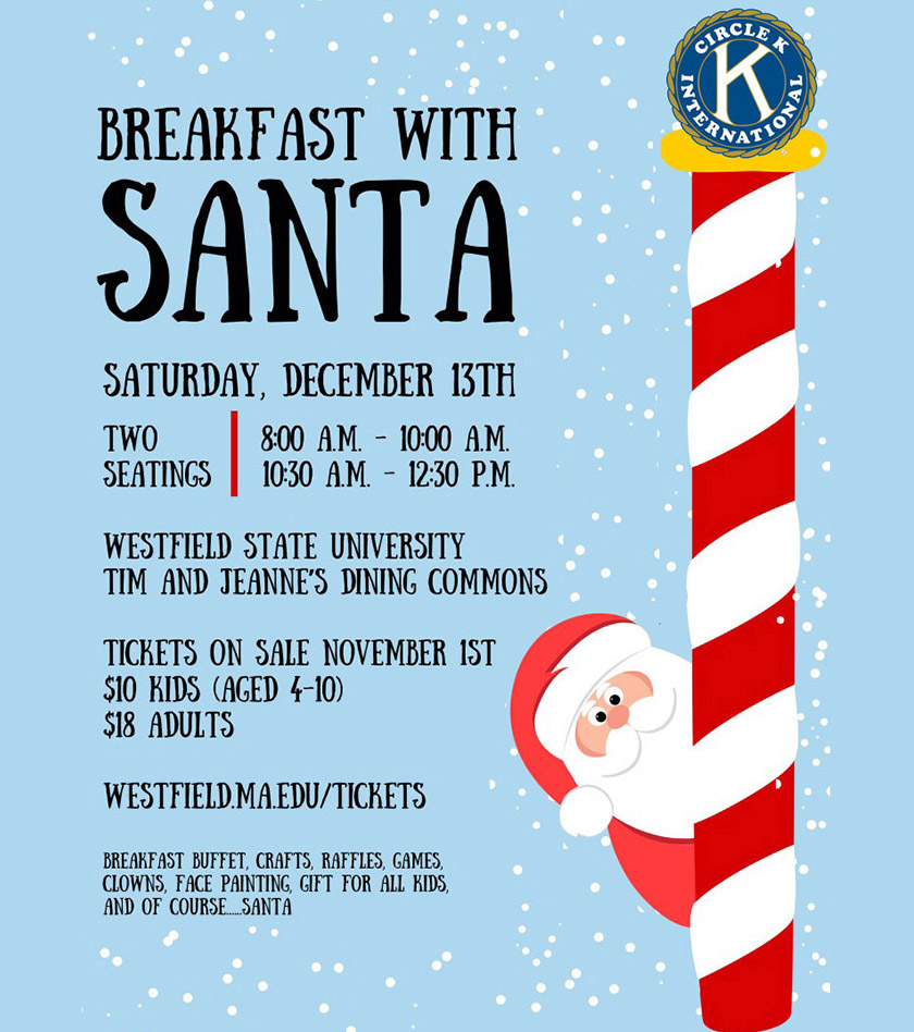 Westfield State University’s Kiwanis Circle K Club will present the event at Tim and Jeanne’s Dining Commons. There will be two seatings, 8:00 – 10:00 AM, and 10:30 AM – 12:30 PM.