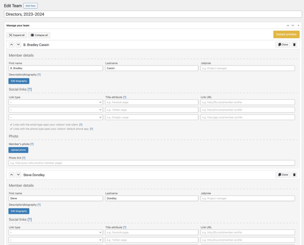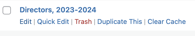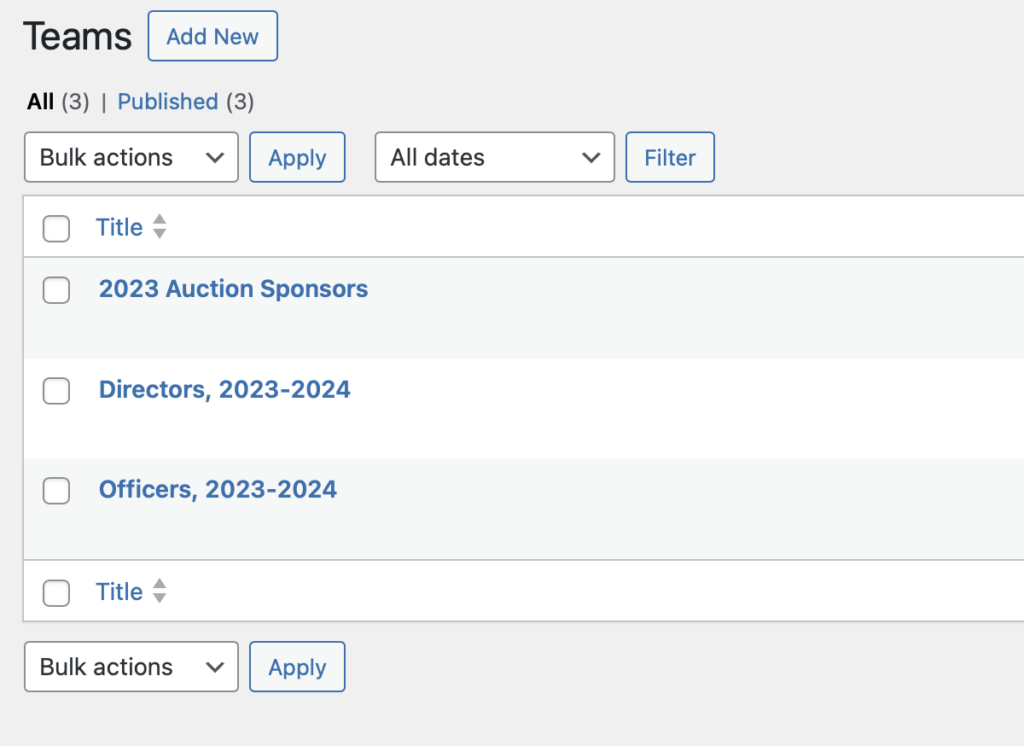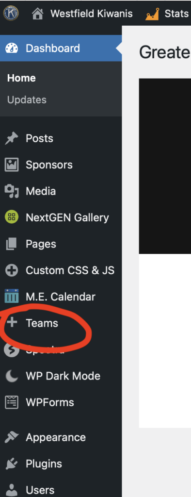 The Officers and Directors page uses a WordPress plugin called Teams. So to manage the Team pages, select “Teams” from the admin menu:
