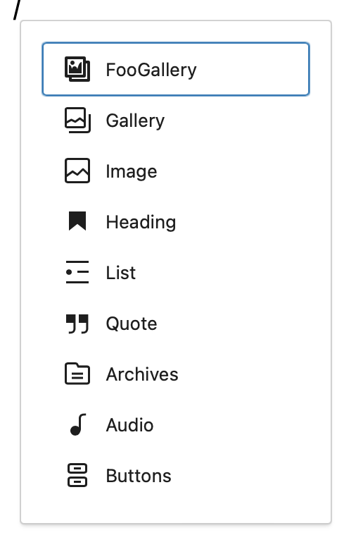 You will then see a list of your most frequently used blocks. Note the first type of block listed is highlighted. This means that if you hit the “enter” key, that type of block will be added to the page. You can also add a block type by clicking on it from the list or using the arrow keys to select the type of block you want. Once highlighted, hit “enter” on the highlighted block to insert that block type.