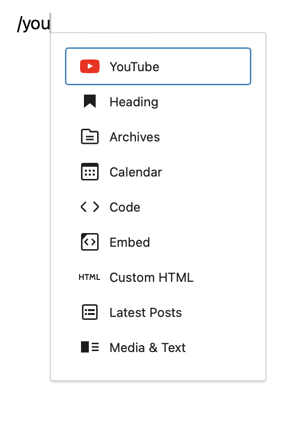 You can also start typing the name of the block and a search will be performed on all the different types of blocks available. For example, let’s say you’d like to add a YouTube video to the page. You just start typing in the name of the block, “you,” and a search will be performed for the name of the block with these letters: