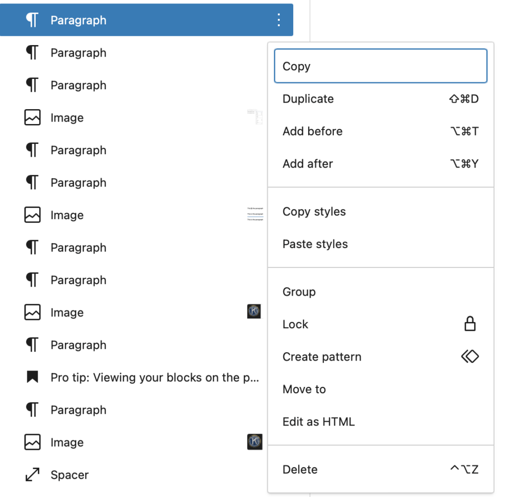 Notice that after a block is selected, there are three dots on the right that can be clicked to open a menu for performing additional actions just like if you clicked the three dots that shows up above the block when you click on it directly on the page.